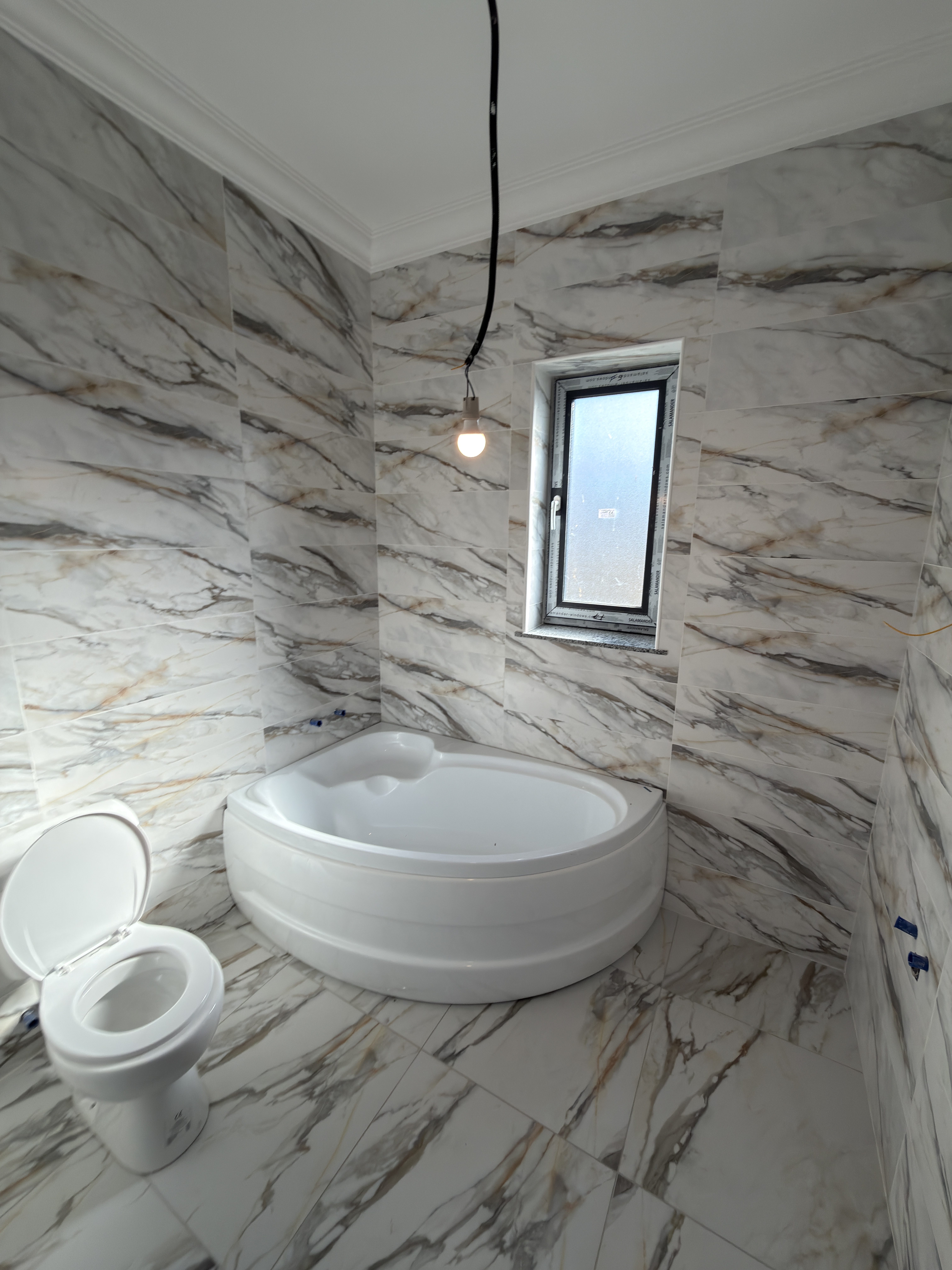 Baie complet utilata: cada pe colt, chiuveta, vas WC