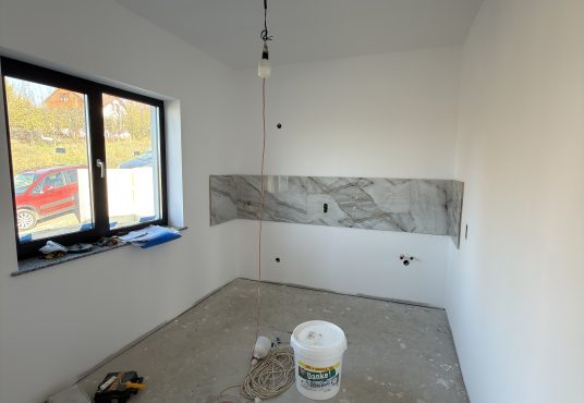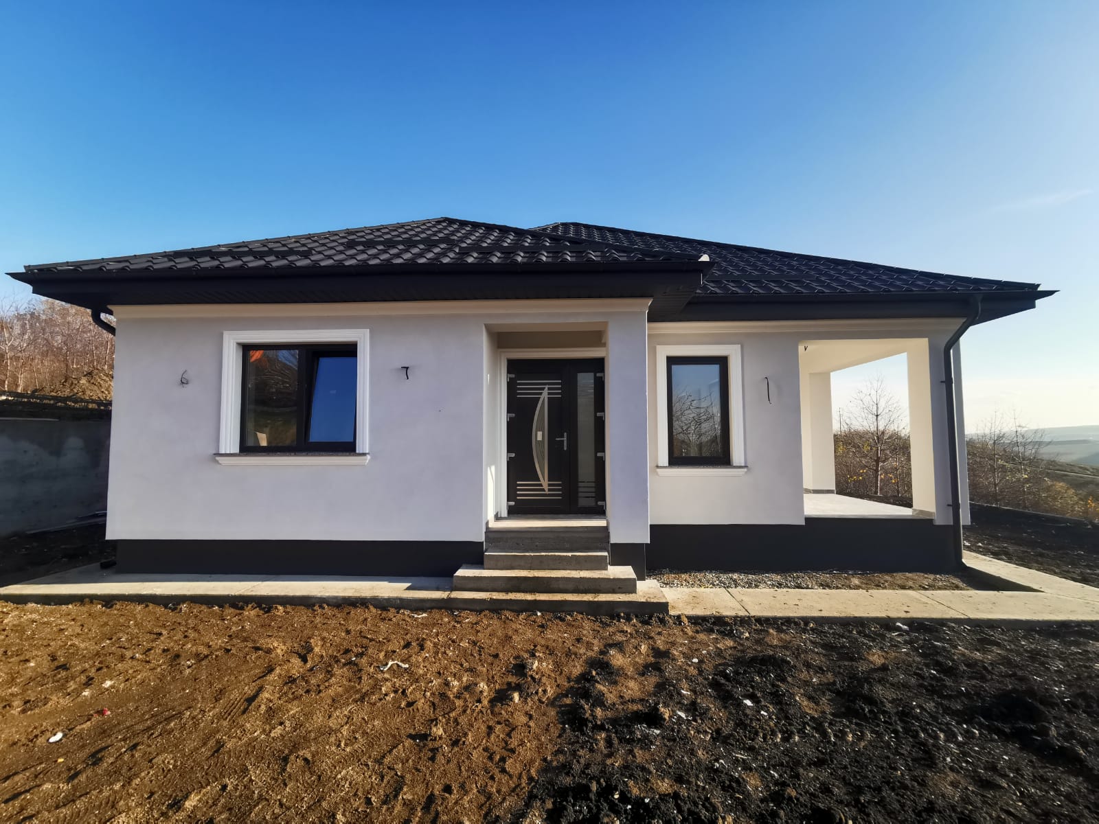 -Acoperis tabla Bilka cu garantie 10 ani, tamplarie PVC Salamander tripan, pervaze granit interior si exterior, izolatie exterioara cu polistiren 10 cm EPS 80, tavan izolat cu polistiren si spuma, terasa placata cu gresie, cu iesire din living si priveliste frumoasa
